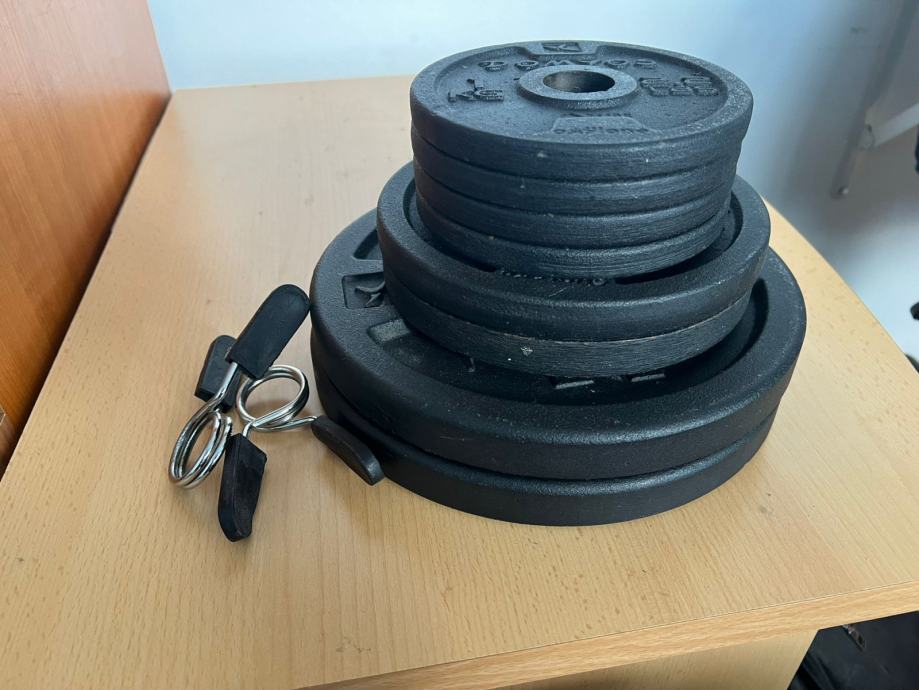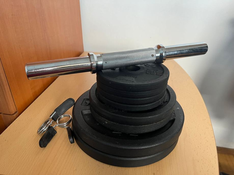 Set sadrzi: 2x5kg, 2x2kg, 4x1kg, sipka 2kg, zatvaraci