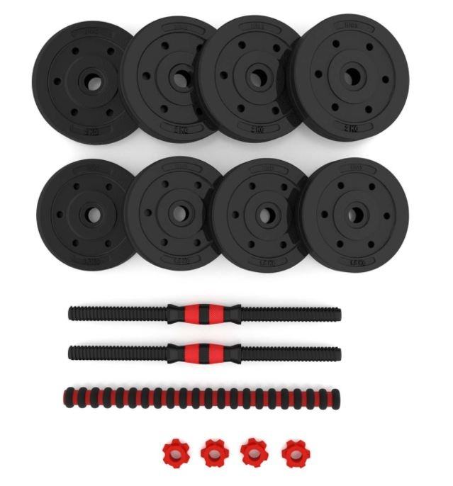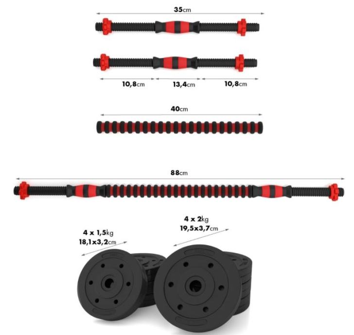 Najnoviji utezi koje možemo sastaviti. Kvalitetan materijal osigurava visoku izdržljivost. Diskovi su obloženi PVC materijalom koji ih dodatno štiti. Osigurači i savršeno usklađen promjer otvora diska omogućuju brzu promjenu težine. Osigurači su s navojem, ali imaju dodatno pojačanje tako da se teret ne pomiče tijekom vježbanja. Dvije kratke šipke mogu se kombinirati u jednu dugu. Ovo inovativno rješenje značajno proširuje mogućnosti vježbanja.Materijal: PVC, cement, željezo, pjenaDimenzije šipke:Duljina: 35 cmPromjer: 25 mmPromjer ručke: 33 mmDimenzije priključka:Duljina: 40 cmPromjer: 43 mmUkupna težina seta: 15 kgKratka šipka x 2Spajanje dvije šipke x 14 x 2 kg diskova4 diska od 1,5 kg4 x osigurači