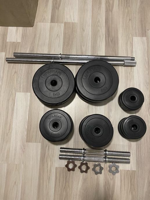 Set sadrži 3 šipke, izrađene od visokokvalitetnog čelika, 4 utega s težinom 5 kg, 8 1,5-kg utega te 8 utega, težak 0,5 kg.
