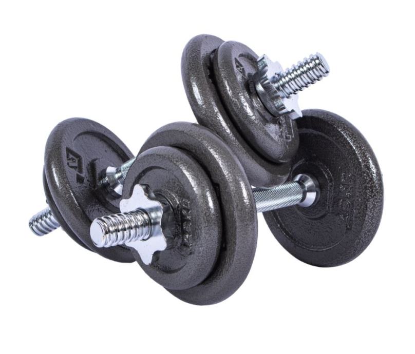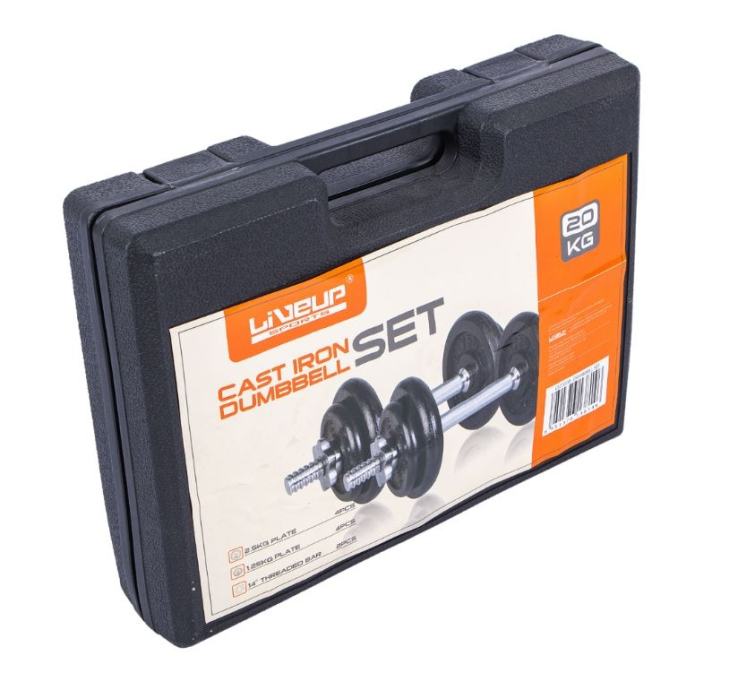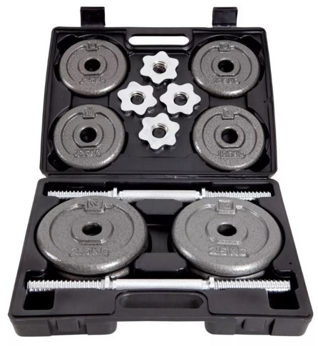Jednoručni utezi u koferu ukupne težine 20 kg. Možemo kombinirati 2 bučice, svaka teži otprilike 10 kg.Osigurači x 41,25 kg x 42,5 kg x 42x šipka 35 cm, 2,2 kg