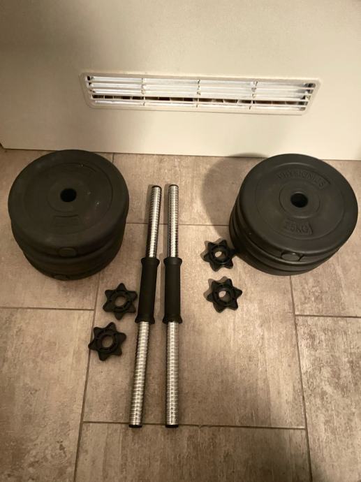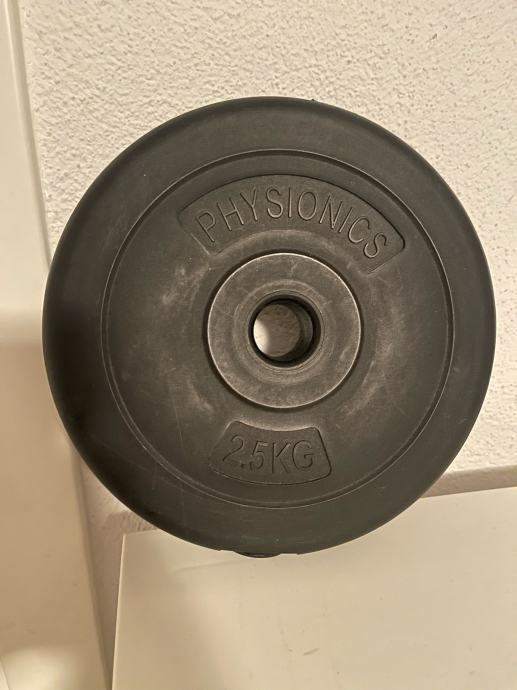Prodajem set utega i bučica marke Physionics, ukupne težine 20 kg. Set se sastoji od dvije šipke za bučice s navojem i gumenim hvatištima, crnih utežnih ploča od 2,5 kg te zaključnih prstenova za fiksiranje ploča. Ploče su gumene, crne boje, promjera prikladnog za standardne šipke.