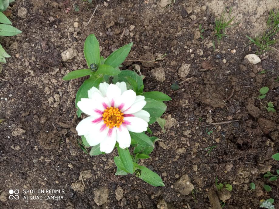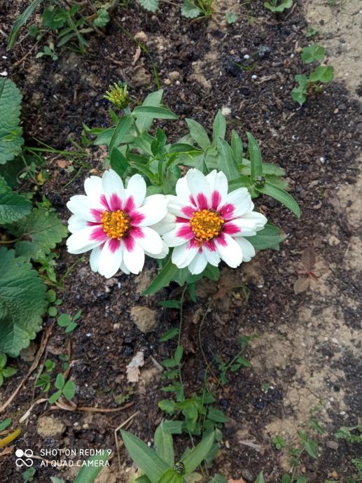 Lijepa niska cinija bijelo crvenih cvjetova .