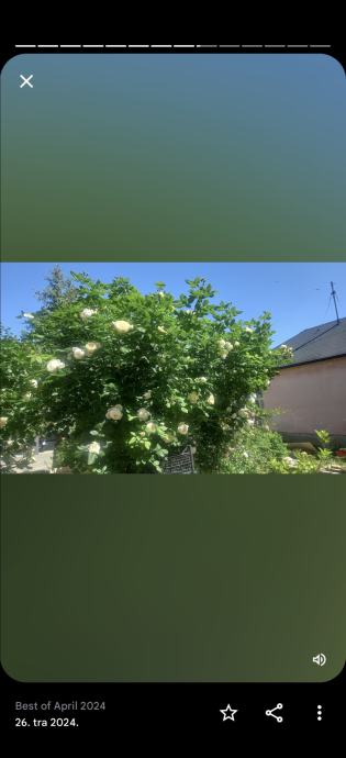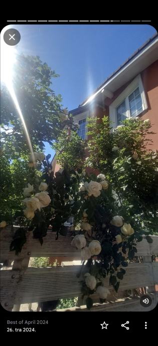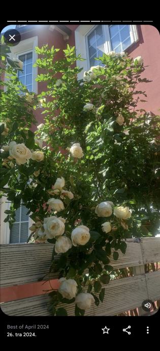 Ruža stablašica, formirani veliki grmovi1- 2 m, šampanj bijela boja, svaka grana na sebi ima cijeli buket ruža tj.puna je cvjetova, predivan miris i izgled 25- 60e