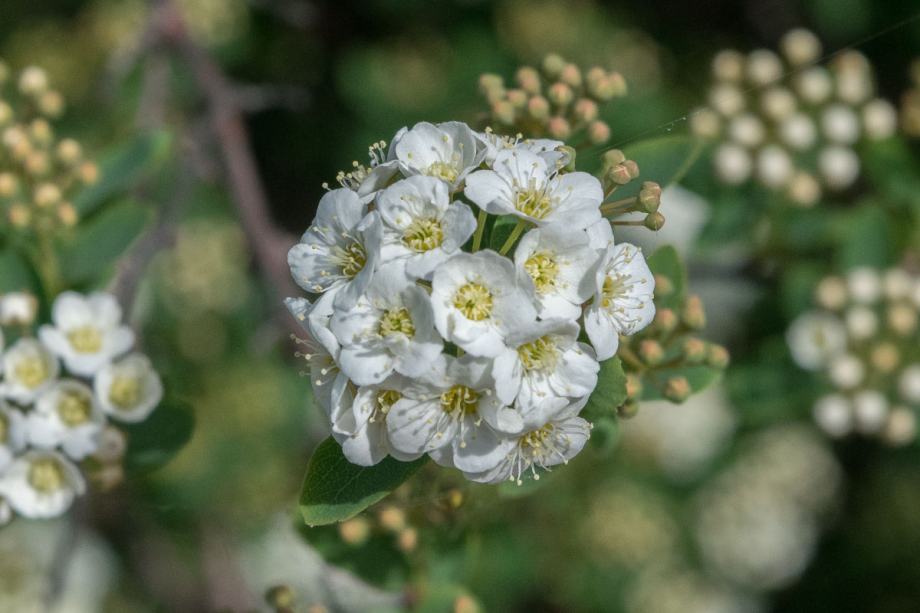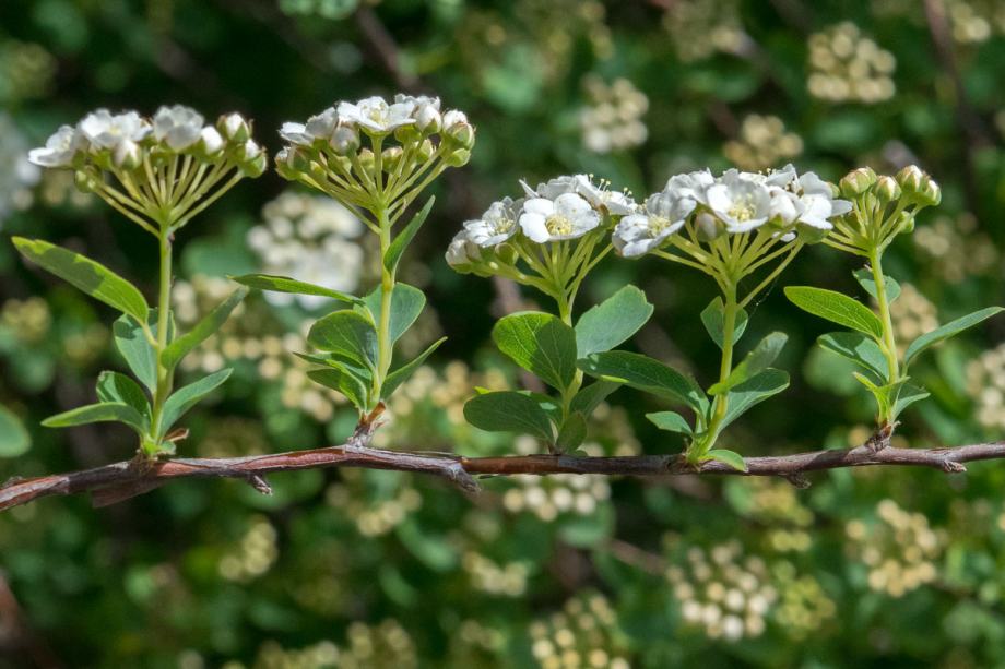Cvate u travnju i svibnju snježnobijelim cvjetićima, ne većim od centimetra, skupljenih u cvatove koji niz grane padaju u slapovima. Listići su sitni, zeleni, lagano nazubljeni.