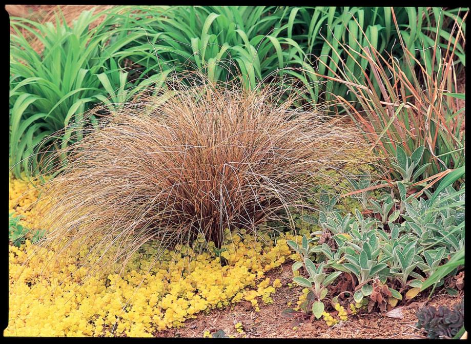 Carex buchananii 'Red Rooster' također donosi teksturu mješovitim nasadima i zadržava svoju boju tijekom cijele godine, što ga čini izvrsnim dodatkom jesenskim i zimskim kontejnerima.
