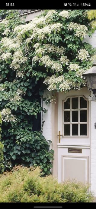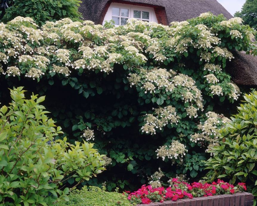 Listopadna penjačica koja cvate u rano ljeto prekrasnim bijelim gustim čipkastim cvjetovima.
