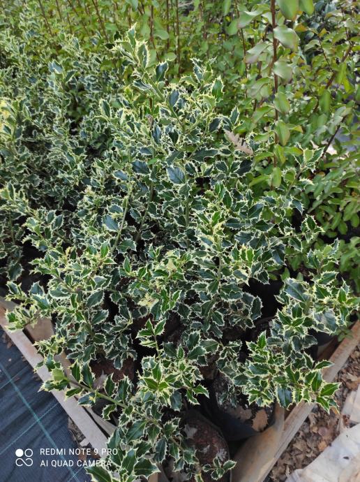 Božikovina “Argentea Marginata”- Ilex aquifolium je zimzeleni spororastući ukrasni grm koji naraste do visine od 3 m. Listovi su kožnati, valoviti, tamnije zeleni sa bijelim rubovima. Koristi se za žive ograde, ali i kao samostalna ukrasna biljka. Može s uzgajati i u posudama. Plodovi su joj crvene boje, koristi se i kao tradicionalni božićni ukras. Dobro uspijeva i na sunčanom i sjenovitom položaju, ali na sunčanom mjestu raste bujnije i gušće. Otporna je na hladnoću.