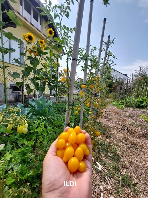 Najranija rajčica s najvećim prinosom. Pravilnih listova, snažne, plodne biljke rajčice koje daju OGROMNE količine 2.5cm, SLATKO, svijetlo-žuto, ovalno (s povremenim plodovima u obliku kruške), 'grožđe '. Rajčice s do 75 rajčica u svakoj hrpi!, dajući velike bukete ovih ukusnih, žutih cherry rajčica. Ildi se često komercijalno prodaje na poljoprivrednim tržnicama kao žuto grožđe. Ove ukusne rajčice obično rađaju do mraza. Odličan izbor cherry rajčica za posluživanje u salatama ili grickanje poput slatkiša. Od žutih cherry rajčica, meni najomiljenija i najrodnija sorta.