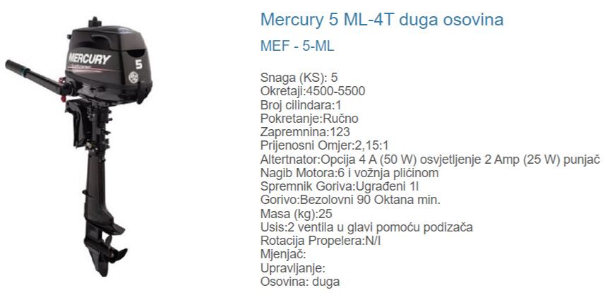 Mercury 5 ML-4T duga osovina kupljen 2020. godine (dobavljač Boltano, Split). Motor nekorišten, uskladišten na suhom. U jesen 2024. prvi puta pokrenut i servisiran ("puštanje u rad") u ovlaštenom servisu u Zg (imam račun). Stalak motora nije na prodaju. Može se sklopiti kupoprodajni ugovor.