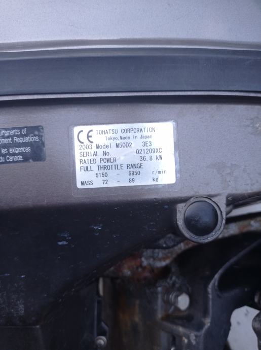 Vanbrodski motor tohatsu 50, 2- takta, manji kvar, ( ne radi jedan cilindar) Motor je u solidnom stanju. Ima trim. Prodajem za popravak ili za dijelove. Samo komplet.