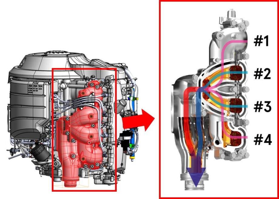 Konstruiranjem da svaki ispušni prolaz bude jednake duljine, spajanje ispušnih plinova svakog cilindra stvara dodatni usis koji pomaže izvući ispušne plinove iz motora.