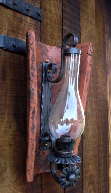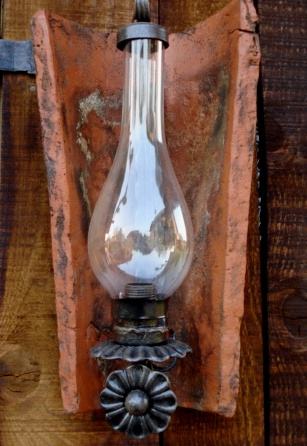 Unikatne vanjske lampe od kovanog željeza na podlozi od starog crijepa sa staklenim cilindrom od stare petrolejke