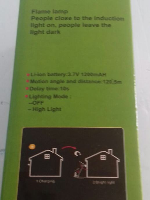 Prodam led solarno punjivu svjetiljku sa senzorom pokreta.dvostruko svjetlo.jedno kao baklja.a drugo jako bijelo 6500 k.samo se pali po mjesečini i noči .reagira na pokret ili dolazak nekoga.Nije potrebna struja .samo se kroz dan puni i po noci na pokret svijetli.Prodam za 259 kn.Moguča dostava postom.Smanjenje sada na 15 e.