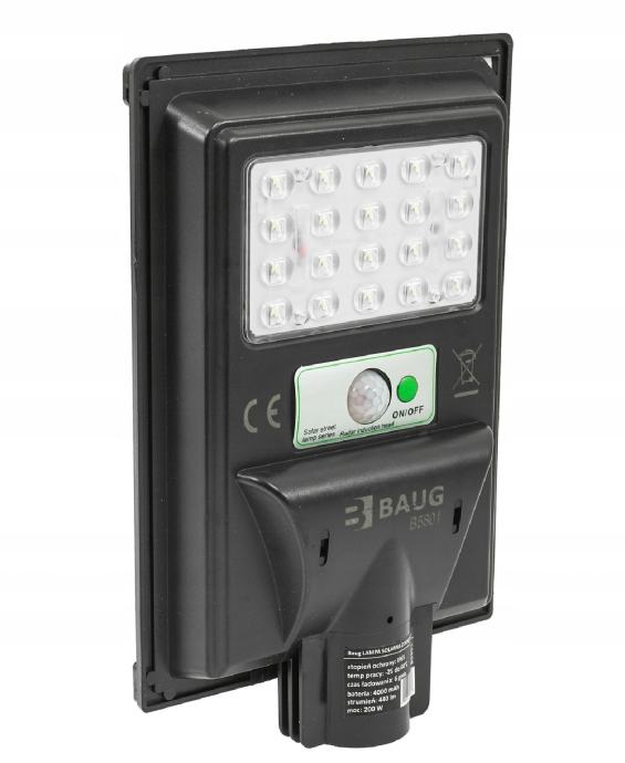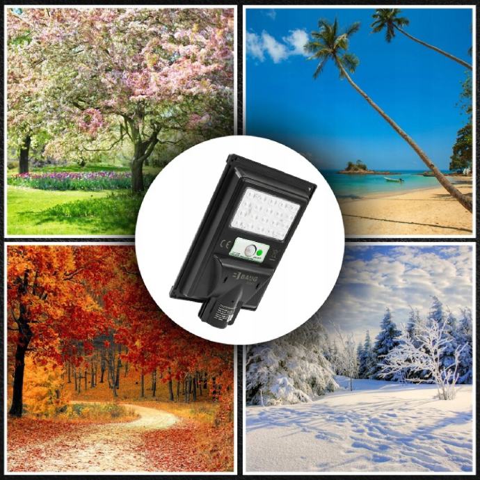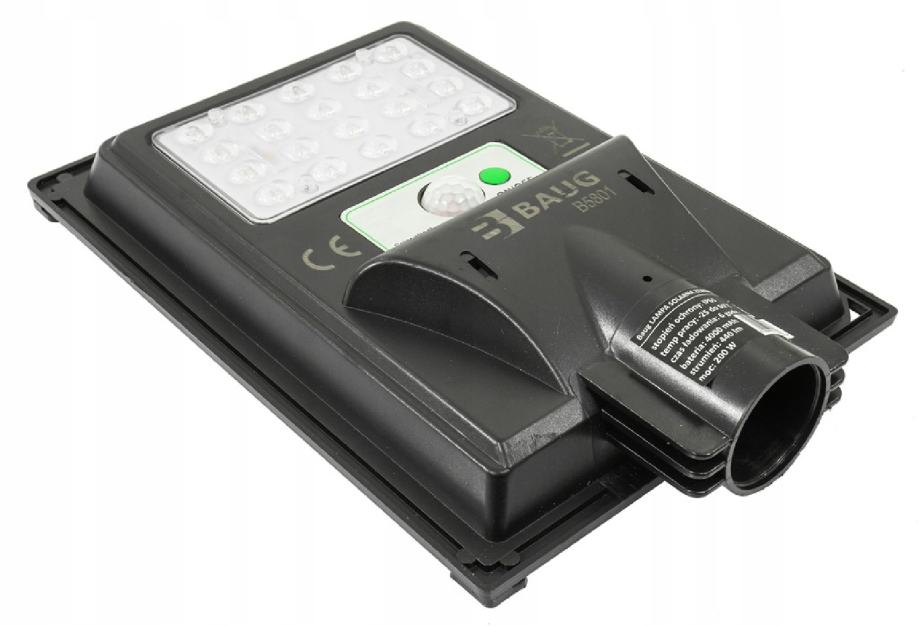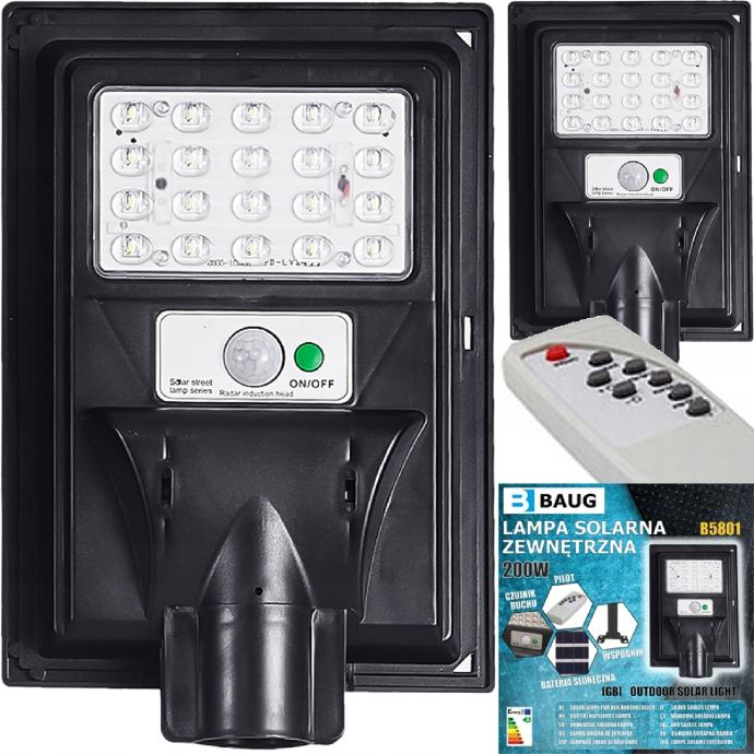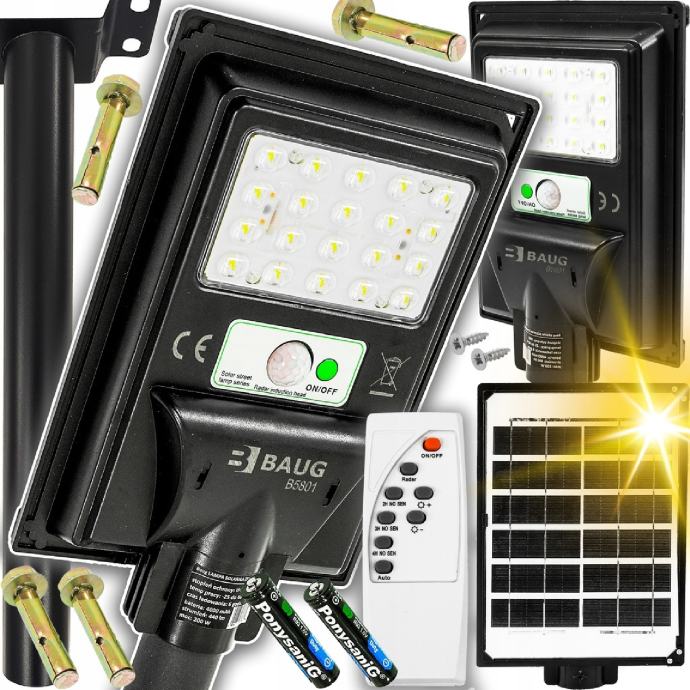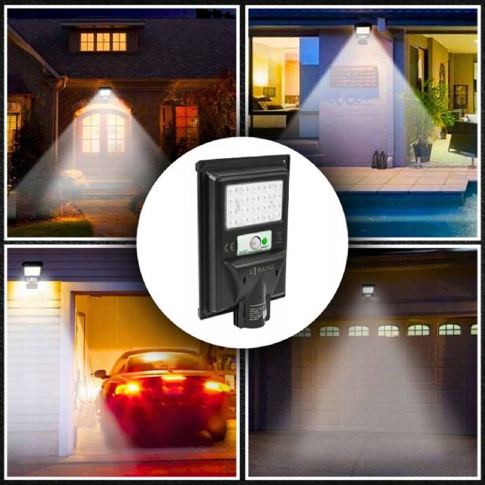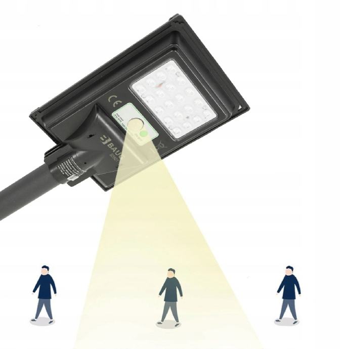 Vanjska solarna svjetiljka. Na vrhu svjetiljke nalazi se solarni panel koji prikuplja sunčevu energiju tijekom dana i pohranjuje se u ugrađenu bateriju. Nakon što padne mrak, svjetiljka koristi prethodno pohranjenu energiju za napajanje LED dioda i osvjetljenje. Senzori pokreta i sumraka ugrađeni u uređaj osiguravaju da se lampa pali samo kada je to potrebno. Kombinacija senzora omogućuje da svjetiljka radi samo nakon što padne mrak, pod uvjetom da se detektira kretanje.