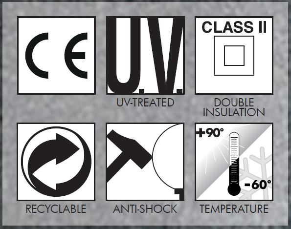 Posjeduje TÜV-CB certifikat, klasa izolacije ll, IP65 zaštita. Boja crna, bijela ili siva.