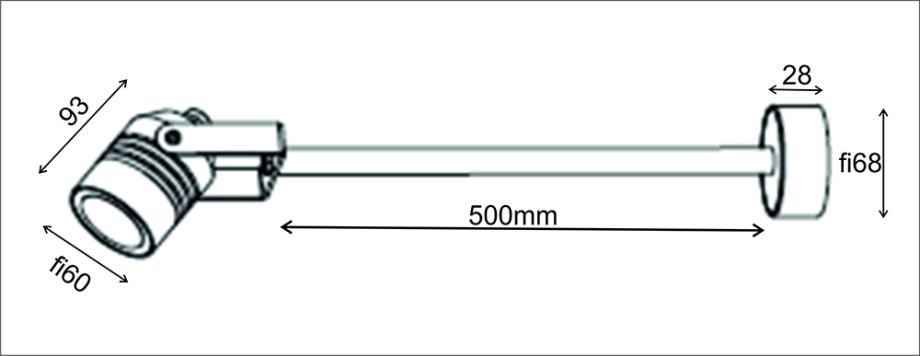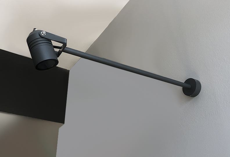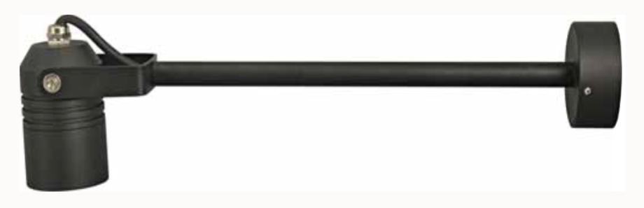 Vanjski usmjereni reflektor s produženim nosačem, za vanjsku ili unutarnju upotrebu, pogodan za osvjetljavanje slika, reklama ili nekih drugih arhitektonskih detalja. Napajanje 240V.