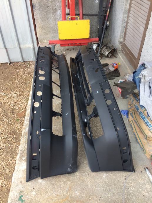 Spoiler i ostala dva dijela su pjeskarena sa sitnim pjeskom,skinuta stara boja i sve temeljito ocisceno. Trenutno u crnom fileru. Spreman za farbanje.