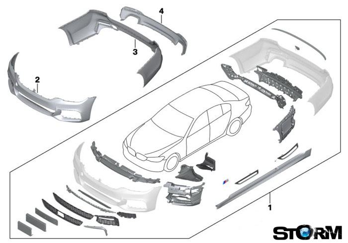 Komplet za naknadnu ugradnju M aerodinamički paket odgovara vanjskim dijelovima posebne opreme M sportski paket. Sastoji se od komlet M paket dijelova za BMW 5 G30.