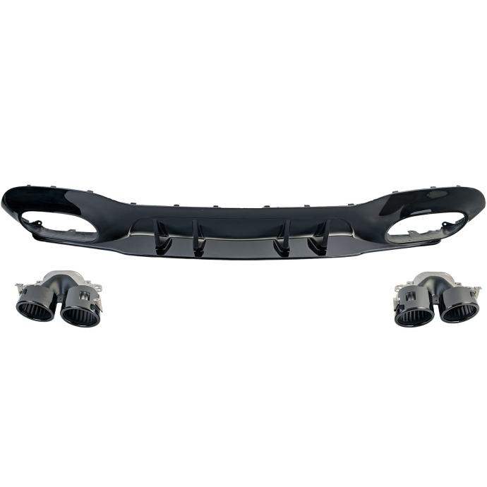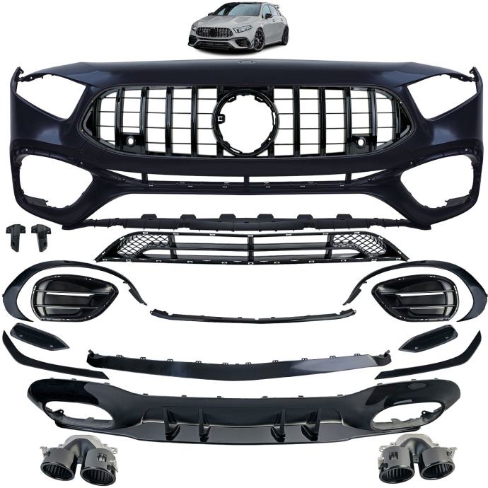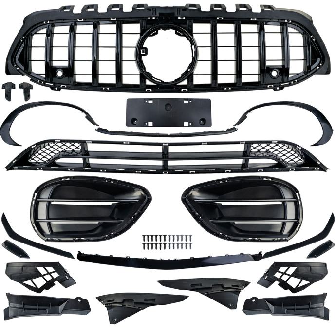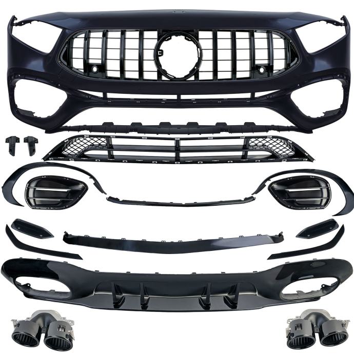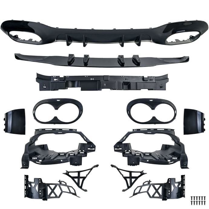 Sveobuhvatni set uključuje sportski prednji branik s umetcima za branik, sportski stražnji difuzor s crnim dvostrukim ispušnim završecima i montažnim hardverom te rešetku hladnjaka u GT stilu. Sve komponente izrađene su od robusne, precizno obrađene ABS plastike i temelje se na originalnom sportskom dizajnu u pogledu oblika i završne obrade – idealno za visokokvalitetnu nadogradnju ili popravak.