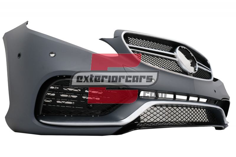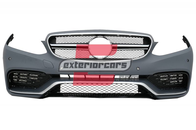 Prednji branik E63 AMG je opremljen sa PDC otvorima, prednjom maskom AMG dizajn, centralnom-donjom mrežicom, bočnim mrežicama i letvicama od brušenog aluminija