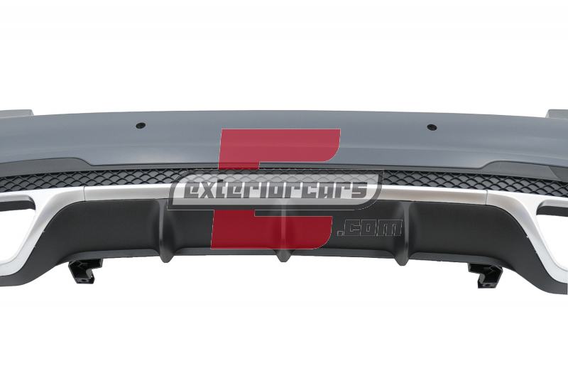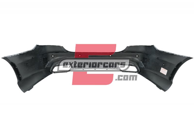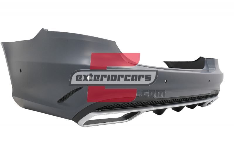 Zadnji branik E63 AMG je opremljen sa PDC otvorima i difuzorom zraka sa dvostrukim izlazima za ispušni sustav i letvicama od brušenog aluminija