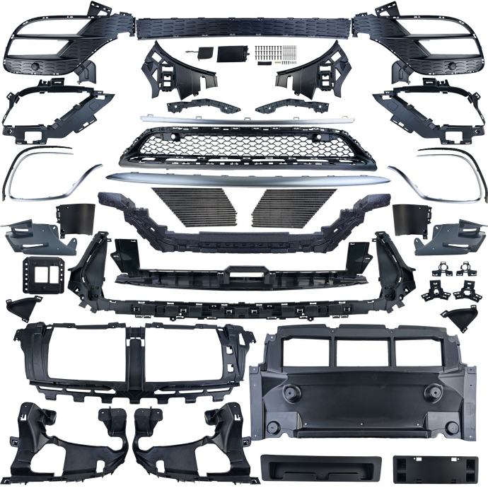 Sveobuhvatni set uključuje sportski prednji branik s umetcima za branik, sportski stražnji difuzor s kromiranim ukrasima ispušnih cijevi i montažnim hardverom te rešetku hladnjaka u GT stilu. Sve komponente izrađene su od robusne, precizno obrađene ABS plastike i temelje se na originalnom sportskom dizajnu u pogledu oblika i završne obrade – idealno za visokokvalitetnu preinaku ili popravak.