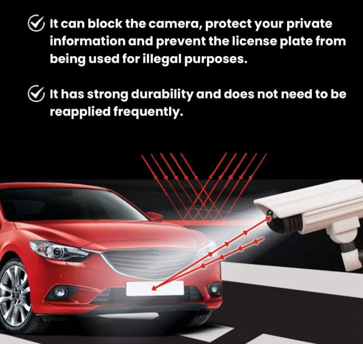 -Photo blocker funkcionira na principu refleksije.Povećava odsjaj na tablicama i na taj način stvara zasljepljuči efekat za kameru ili radar,tako da se tablice uopće ne vide.