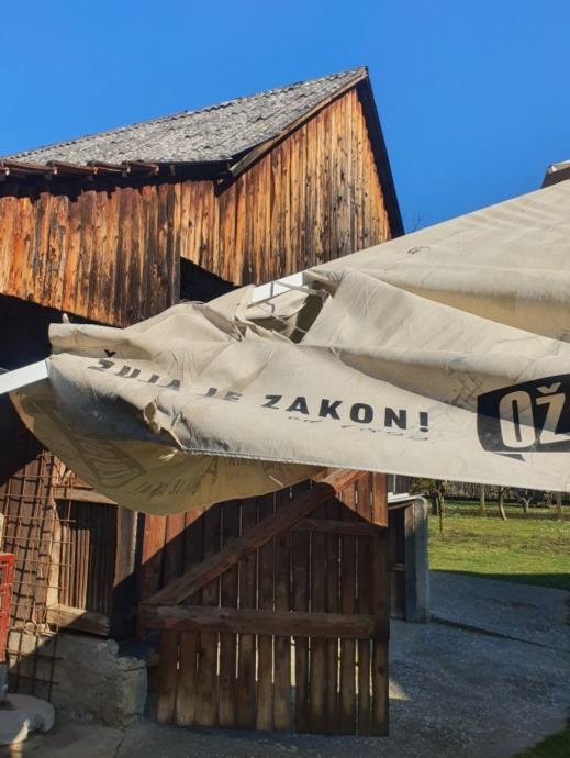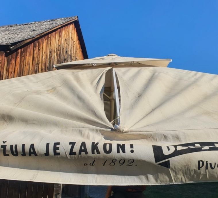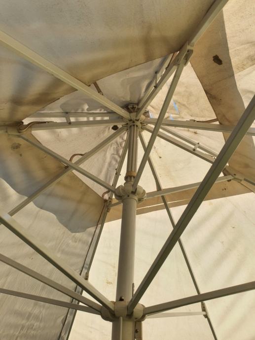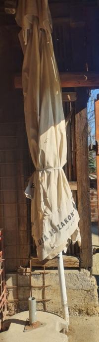 Prodajem ugostiteljski suncobran s krovičkom dimenzija 3,5x3,5 metara, metalna konstrukcija s betonskim postoljem fi 70cm.