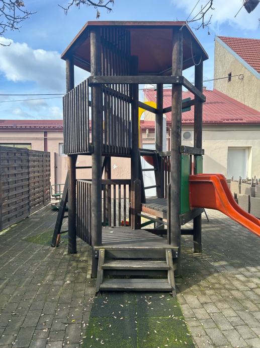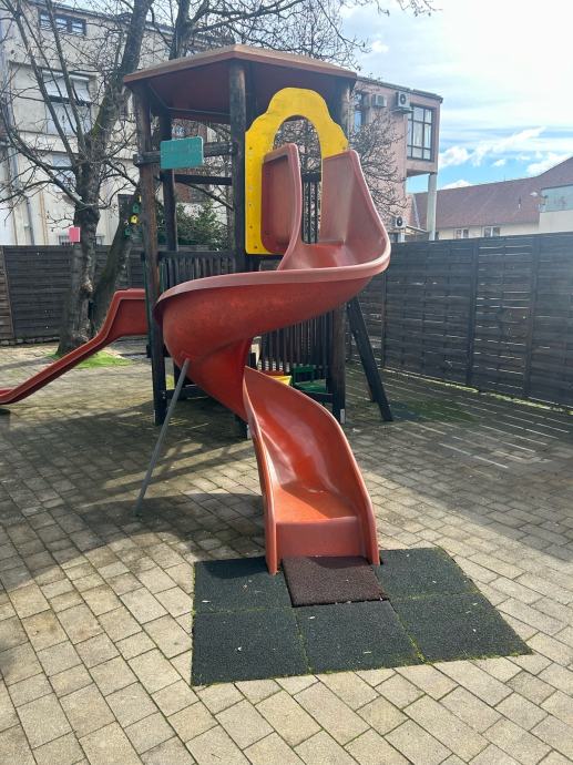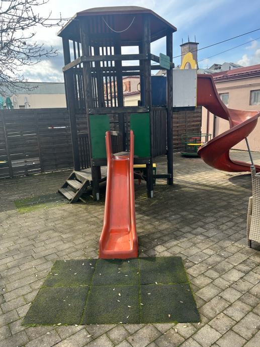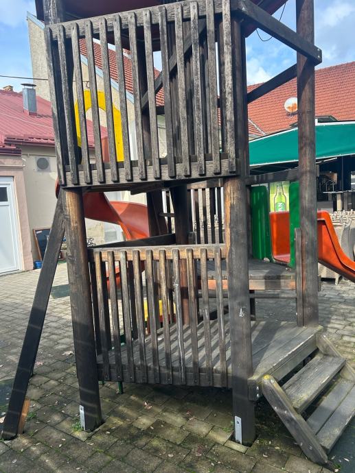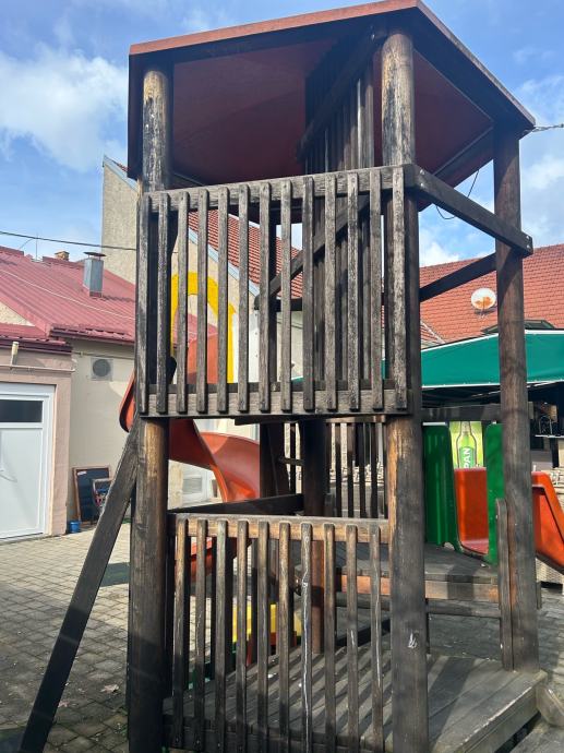 Prodajem kompletnu ugostiteljsku opremu za vanjsko ugostiteljstvo. Radi se o drvenom igralištu za djecu s tornjem, klizaljkom narančaste boje sa stepenicama, vrtuljak i 2 sprave na feder konjić i dalmatinac.Konstrukcija je solidna i stabilna, napravljena od masivnog drveta tamnosmeđe boje. Toranj ima dva nivoa s drvenim ogradama i vertikalnim letvicama, a uključuje i crvenu tobogansku roletu. Klizaljka je u narančastoj boji i nalazi se na 2 strane strukture. Cijela postavka zauzima prilično prostora i pogodna je za postavljanje u vanjskim prostorima ugostiteljskih objekata. Sve je montirano i spremno za demontažu i premještanje. Cijena nije fiksna…