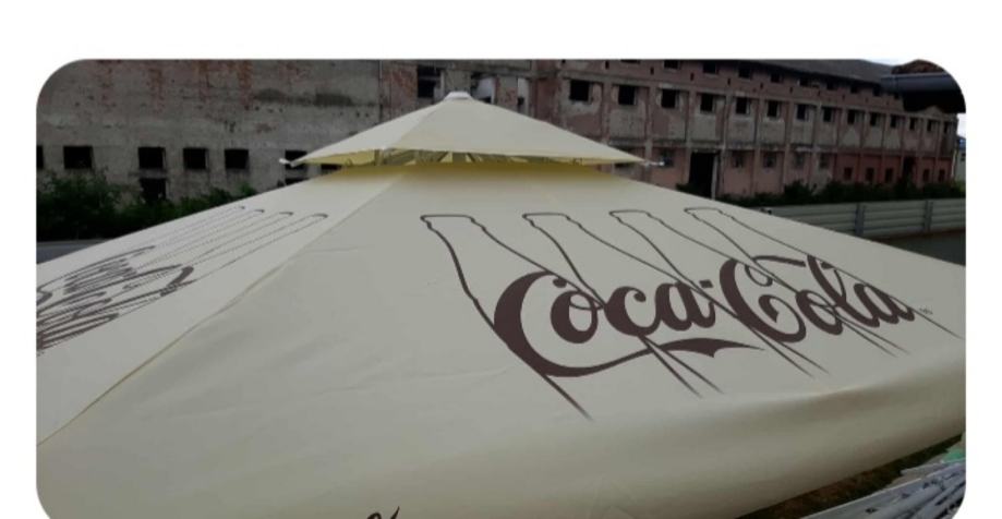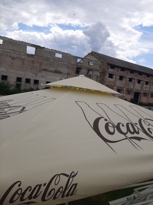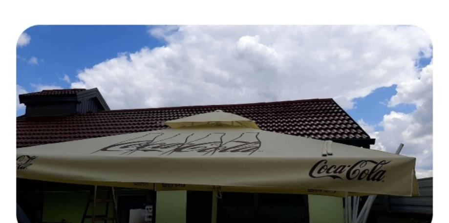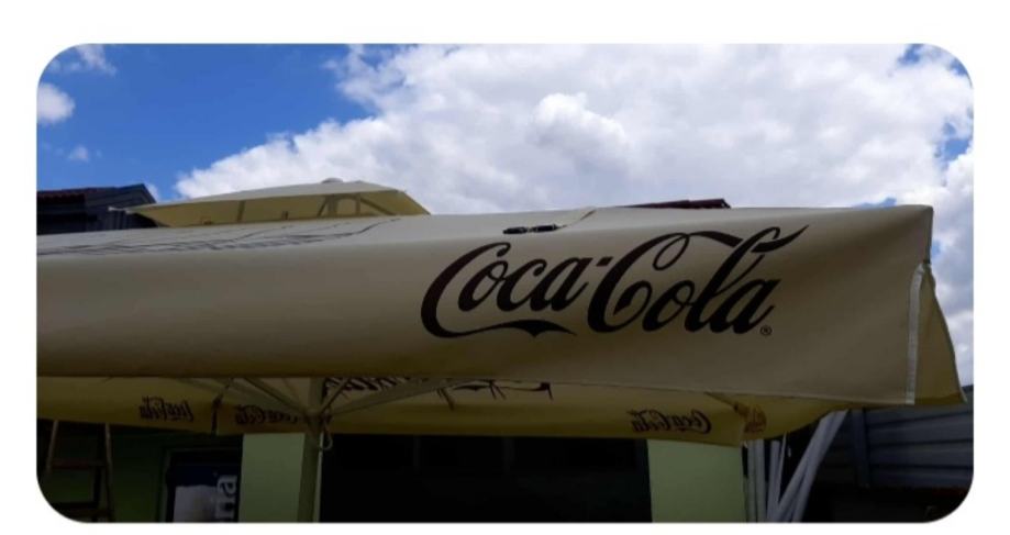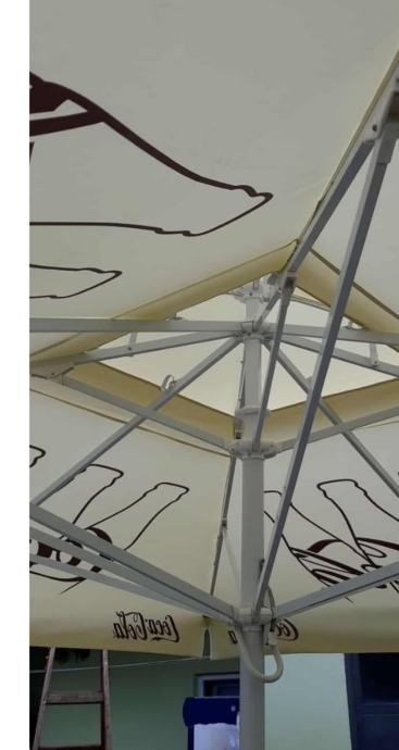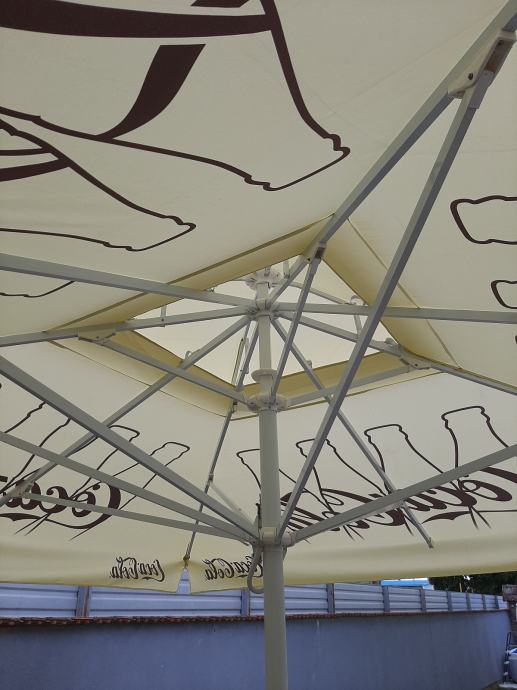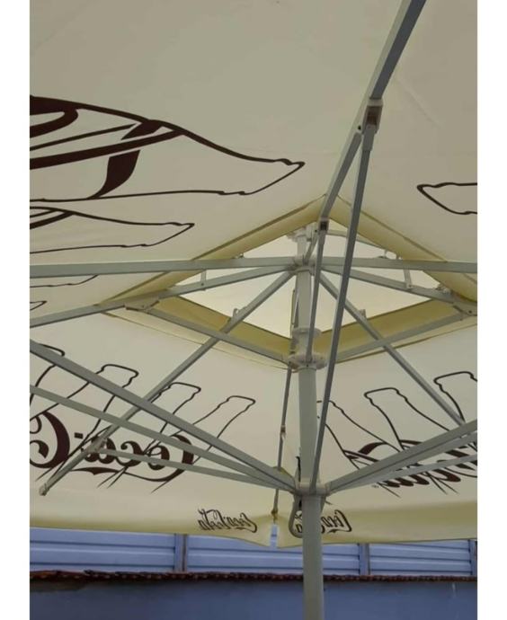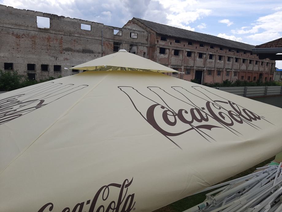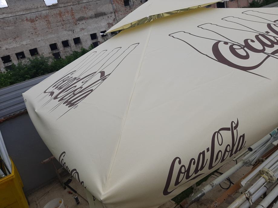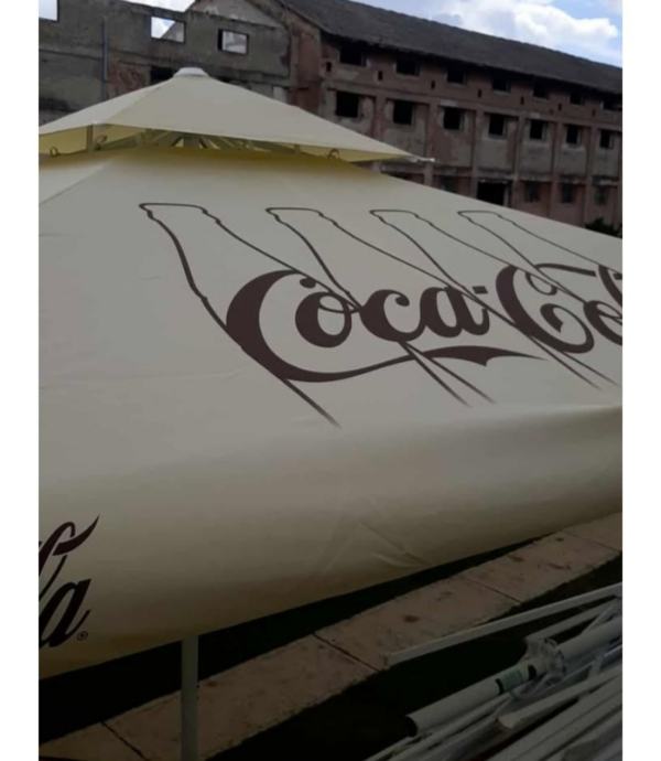 Ugostiteljski suncobran 3 5X3 5 met Coca Cola Teleskopsko otvaranje pomoću ručice Stalak Betonski sa kvarcnim kamencicima ili sa kockama I pocincanim stalkom Navlaka za čuvanje vašeg suncobrana od materijala na patent za dugi niz godina korištena
