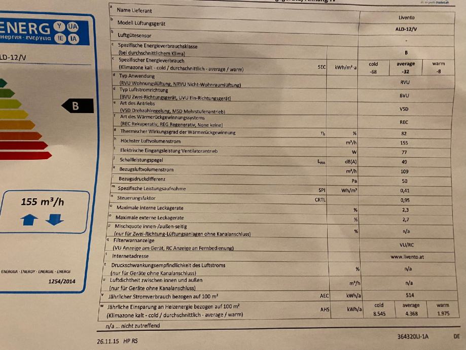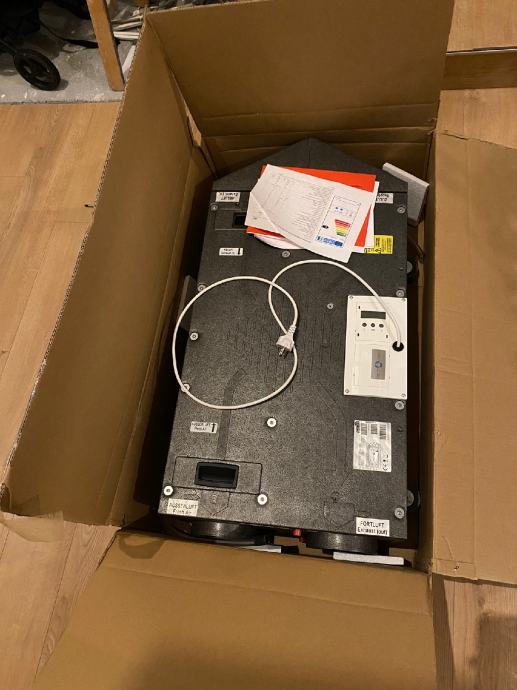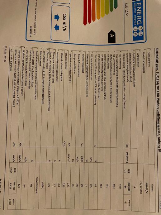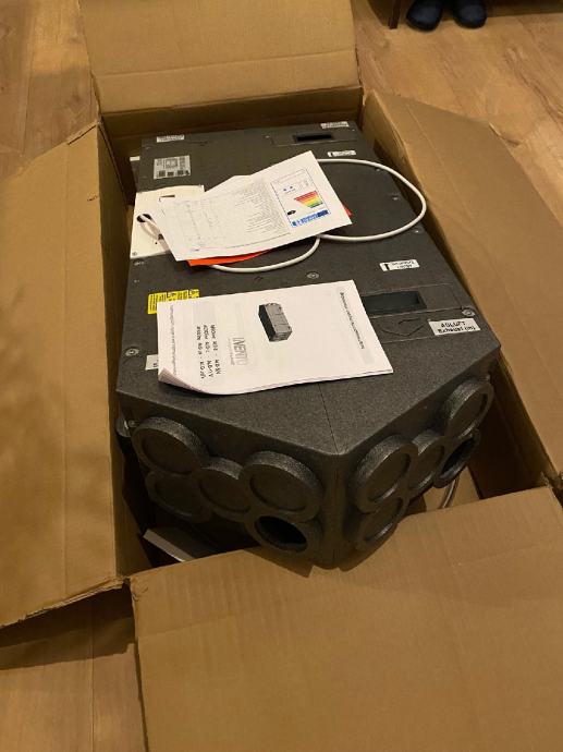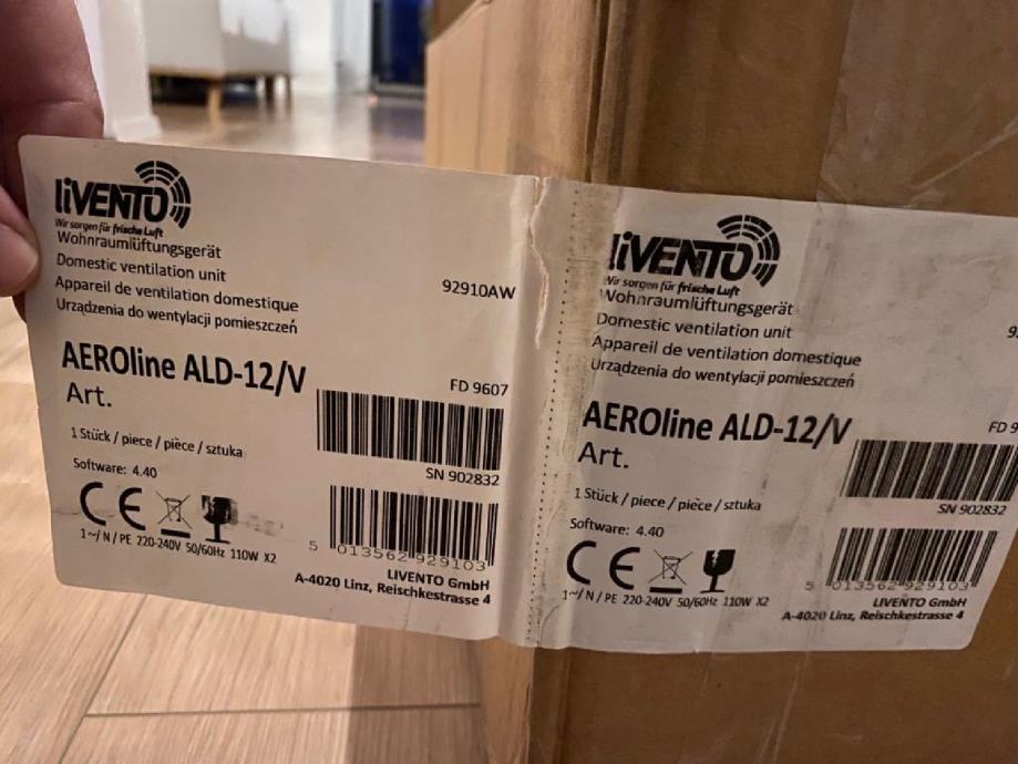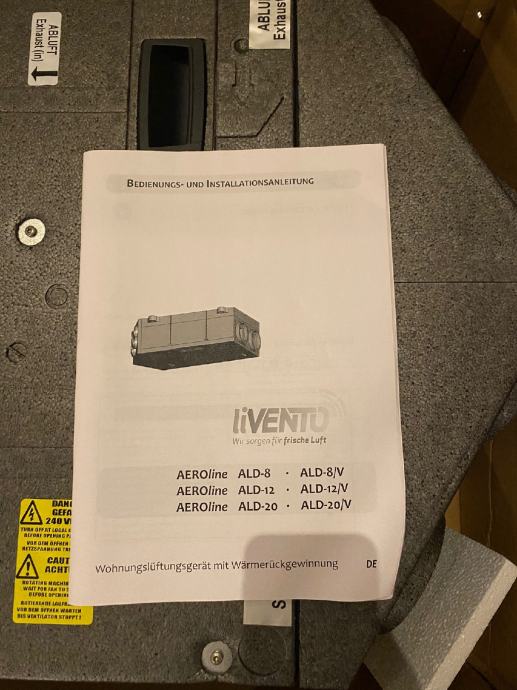 Prodajem novu ventilaciju s rekuperacijom za kucnu upotrebu Livento ALD-12/V. Radi se o manjoj centralnoj jedinici s ugrađenim razdjelnikom s 5 otvora za upuhivanje zraka (sobe) i 5 otvora za ispuhivanje (kupaonice, kuhinja). Max kapacitet je 155m³/h. Ugrađuje se ispod stropa ili na pod.