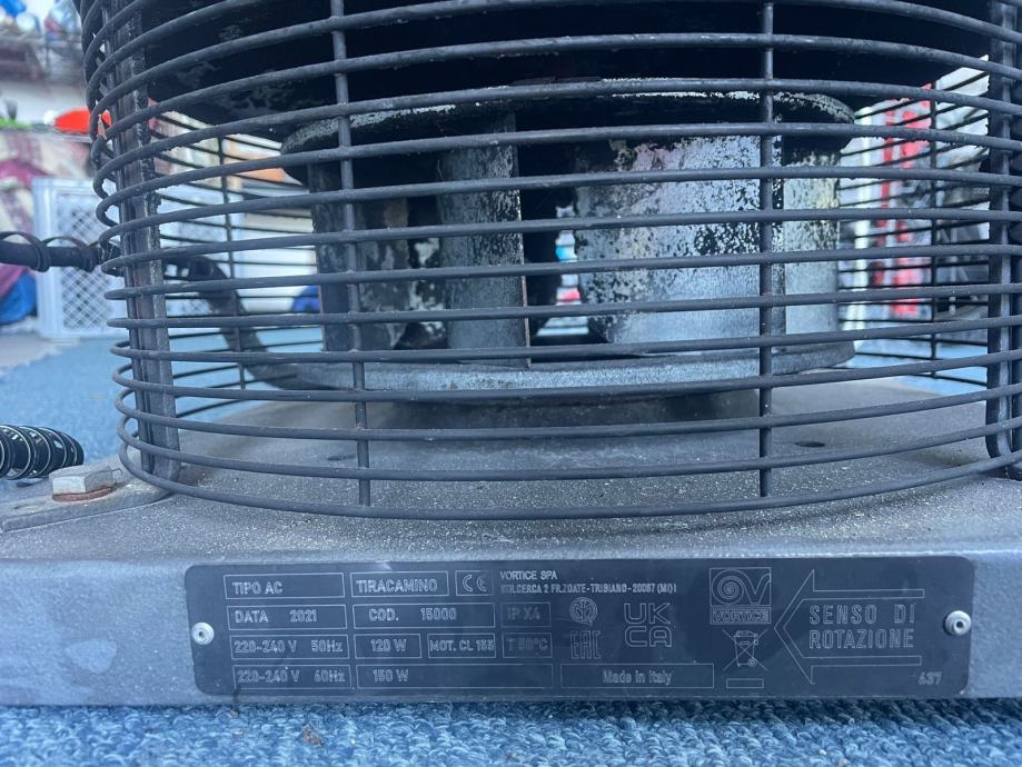 Ventilator za kamine i roštilje Tiracamino TC. Dizajniran je za povećanje propuha dimnjaka kada je vatra otvorena. Tiracamino je ispušni ventilator prikladan za kontinuirani rad temperatura do 200 celzijevih stupnjeva. Ventilator je opremljen posebnom čeličnom konstrukcijom za otpornost na vremenske uvjete. Ventilator za dimnjak Tiracamino može se koristiti i kao uobičajeni krovni ventilator, ako je vatra u kaminu, ventilator mora biti uključen. Moguća korekcija cijene za pravog kupca.