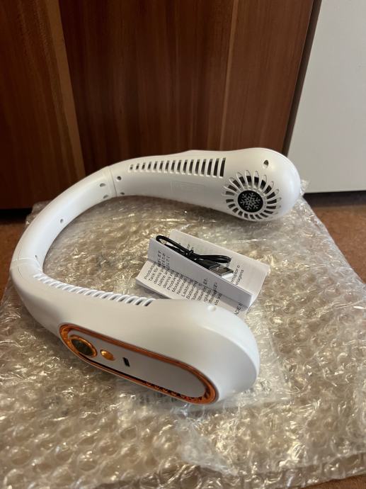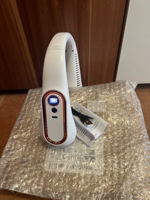 NOVI prijenosni ventilator za vrat bijele boje. Puni se na usb i ima 5 brzina hlađenja. Digitalni prikaz stanja baterije. Vrlo je praktičan za ljetne vrućine jer ugodno hladi i možete ga koristiti u zatvorenom i otvorenom prostoru.