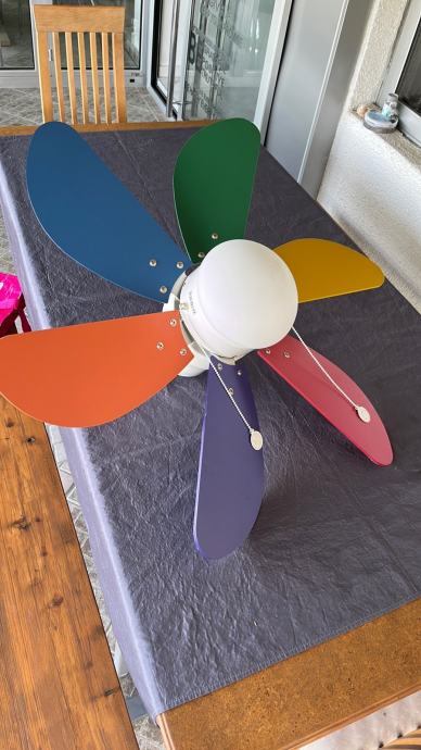 Prodajem stropni ventilator 3brzine, šareni, vrlo atraktivan, malo koristen, dodatno ima i svjetlo, promjer oko 80cm, duzina lopatice oko 35cm