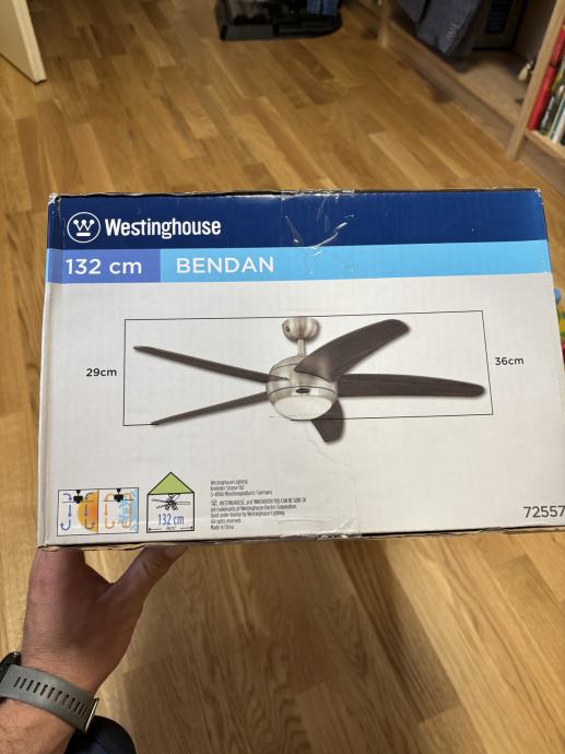 Stropni ventilator američkog brenda Westinghouse. Dolazi s daljinskim upravljačem. Moguće koristit samo svjetlo, samo ventilator ili oboje istovremeno.