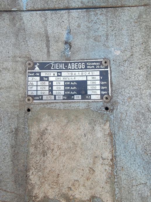 Prodajem axijalni vrntilator renomiranog Njemačkog proizvođaća Zielh Abegg ,model DAS 350 4-4-8 , isti je 380V ,3 brzine,(700/1000/1400 rpm , tehnička kartica u prilogu sa slikama!!! )