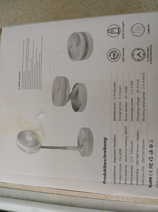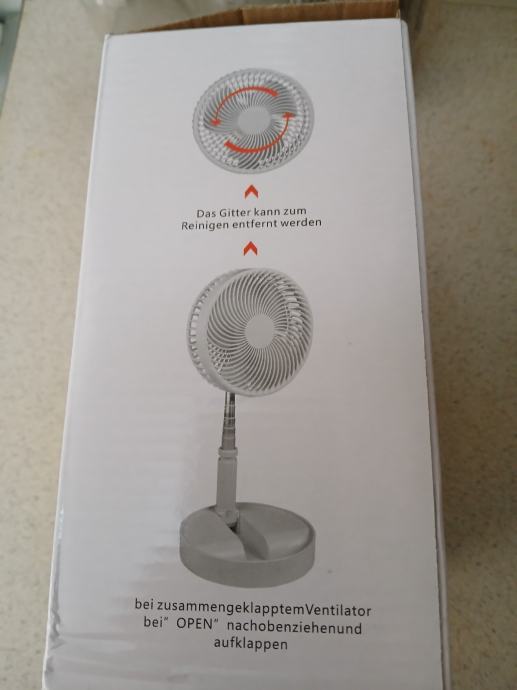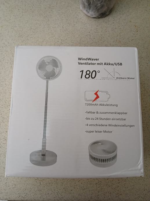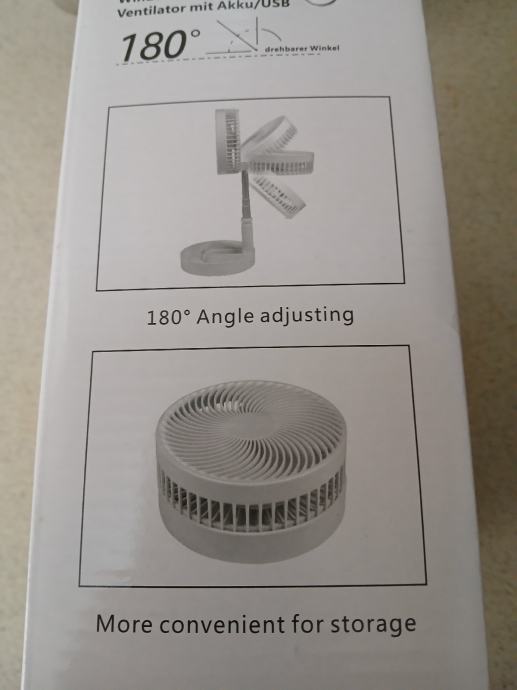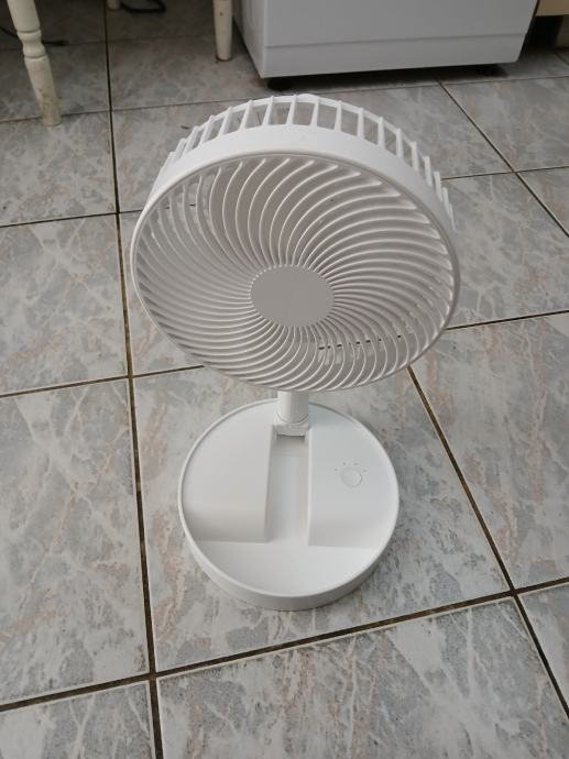 Ventilator promjera 170 mm , teleskopsko podesiva visina , tri brzine vrtnje , baterija se puni sa punjačem mobitela
