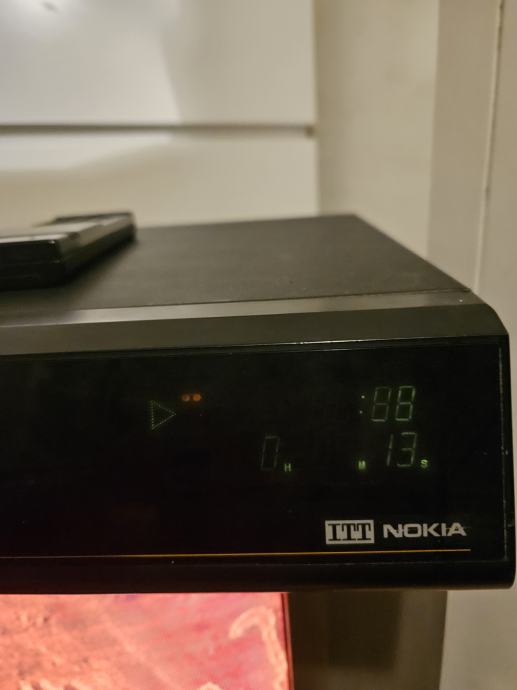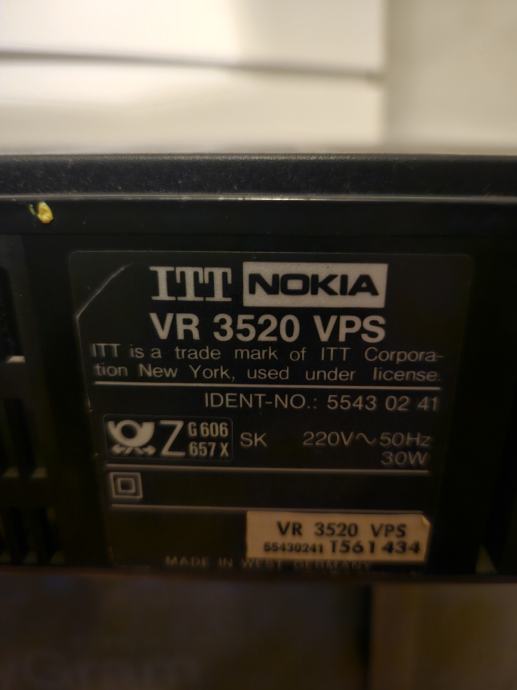 DetailsProductITT Nokia 3520 VCR (Videocassette Recorder)Power\(220V\text{,\ }50Hz\text{,\ }30W\)Video SystemVHS PALHigh QualityHQ (High Quality) recordingTunerTuner channels 30-39Inputs/OutputsSCART (Euro AV), RF antenna in and out, V-lockControlRemote control and on-device functional keysDisplayNumbers are faint on the display