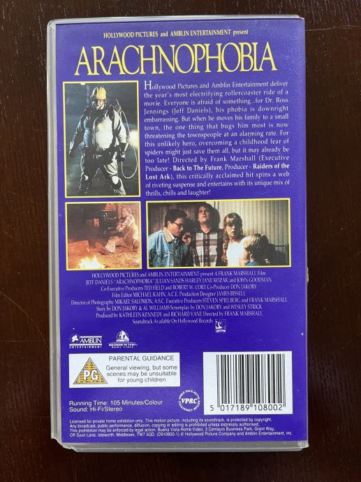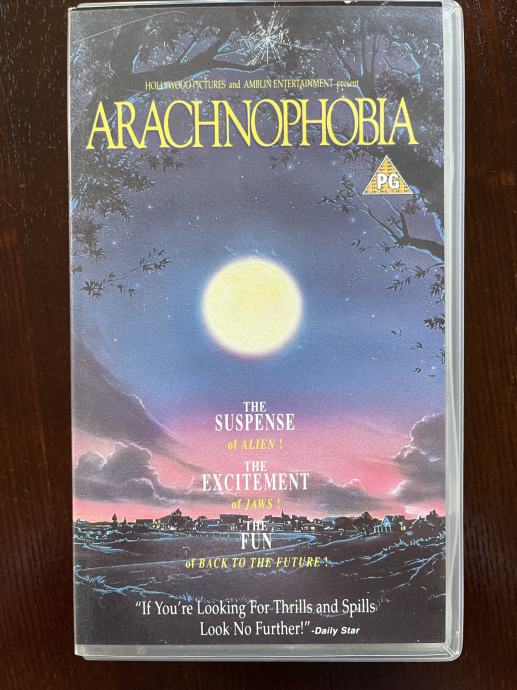 Prodajem komičnu strašilicu ARACHNOPHOBIA na VHS vrpci u izvrsnom stanju. Ovaj malo zapaženi film kojega je režirao nadareni Frank Marshall, sa sjajnim Jeffom Danielsom i još genijalnijim Johnom Goodmanom, posve je nepoznat, a radi se o kultnom filmu.