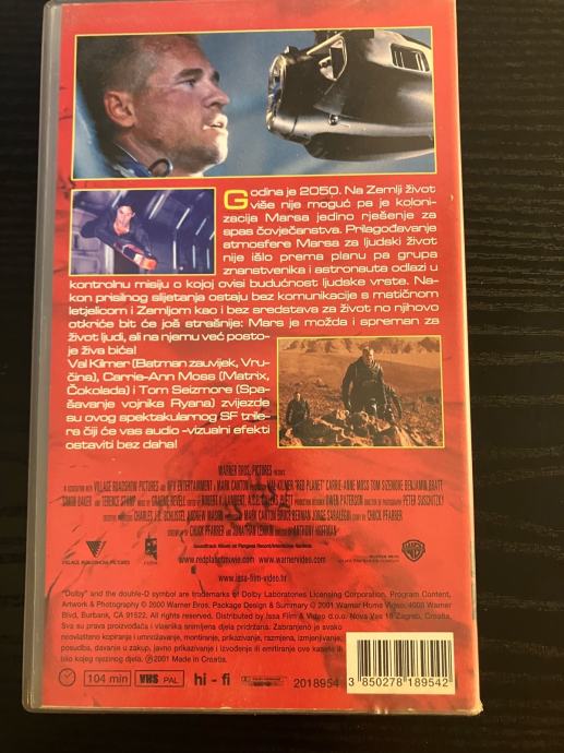 Crveni planet / Red Planet - VHS kaseta. 4 fotografija je u oglasu. Cijena je 5 EUR za osobno preuzimanje u Popovači ili Ivanić Gradu. Troškovi slanja su dodatna 4 EUR Tiskom ili Poštom za unaprijed uplatu na račun ili 6 EUR za plaćanje pouzećem. Pakiram tako da je sigurno u transportu. Odgovaram na pozive, poruke putem Njuškala, SMS, Viber.