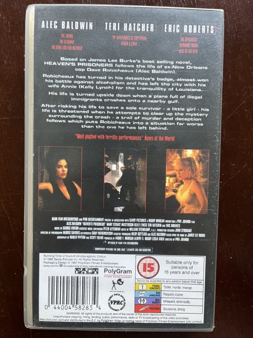 Prodajem film na VHS traci HEAVEN'S PRISONERS snimljen prema sjajnom romanu Jamesa Lee Burka u režiji Phila Janoua. Roman je bolji od filma, ali film je gledljiv ponajviše zbog lokacija i Teri Hatcher.