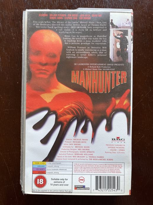 Prodajem film na VHS traci MANHUNTER režisera Michaela Manna, snimljen prema romanu Thomasa Harrisa. Iako nije jednako dobar kao Tišina jaganjaca Mann ne zna napraviti loš film, a Brian Cox u ulozi Hanibala Lecktora je jezovit na posve drugačiji način od Anthonyja Hopkinsa.