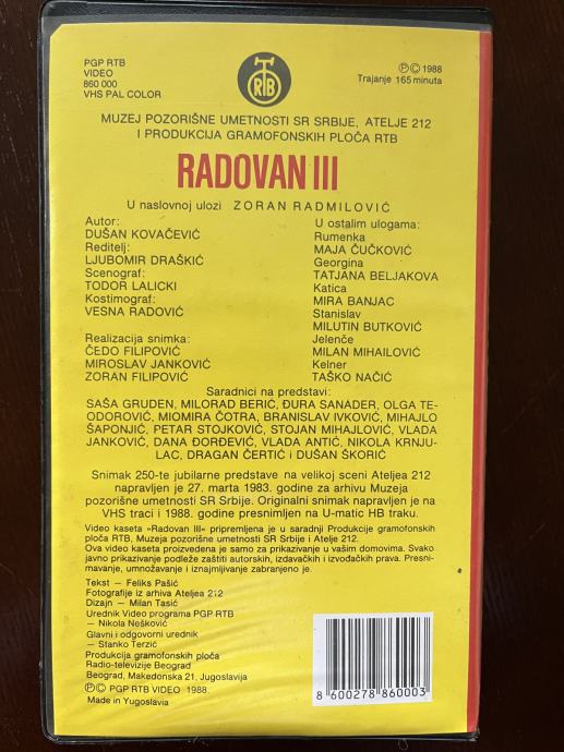Prodajem snimku kultne kazališne predstave RADOVAN III. na VHS vrpci u savršenom stanju. Predstava koja je glumca Zorana Radmilovića i dramskog pisca Dušana Kovačevića ustoličila kao regionalne kazališne superzvijezde snimljena je na VHS vrpci tijekom jubilarne dvijestotine i pedesete izvedbe na sceni legendarnog boegradskog kazališta Atelje 212 u ožujku 1983. godine za arhiv Muzeja pozorišne umetnosti SR Srbije. Vrpca koju prodajem puštena je u prodaju 1990. godine te još uvijek sadrži originalni kupon.