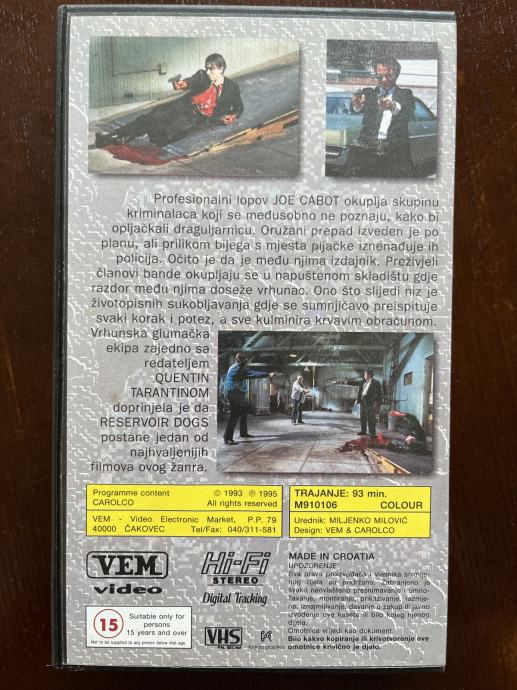 Prodajem film RESERVOIR DOGS na VHS traci u savršenom stanju. Hr. prijevod i titl.