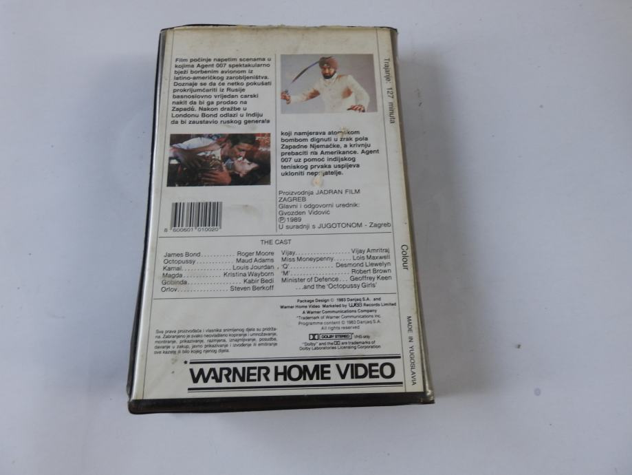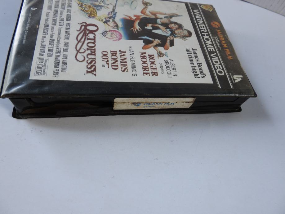 Na prodaju je originalna VHS kazeta kultnog Bondovog filma "Octopussy" s Rogerom Mooreom u glavnoj ulozi. Riječ je o rijetkom izdanju iz bivše Jugoslavije (proizvedeno u suradnji s Jadran Filmom – Zagreb i Warner Home Video), s hrvatskim (ili srpskohrvatskim) titlovima na omotu i opisom na poleđini.