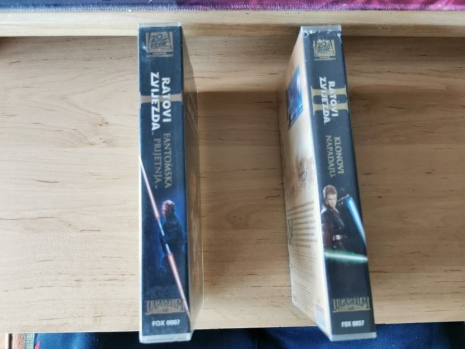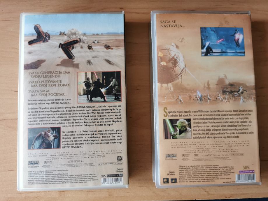 Prodajem rabljeni komplet Star Wars filmova na VHS kasetama, prvi i drugi dio kultne sage. Kasete su u dobrom stanju i sadrže "Fantomsku prijetnju" i "Klonovi napadaju", idealno za kolekcionare ili obožavatelje Star Warsa.