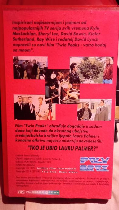 Prodajem rabljenu VHS kazetu kultnog filma "Twin Peaks: Vatro hodaj sa mnom" redatelja Davida Lyncha. Ova akcijska VHS kaseta je u dobrom stanju s originalnim omotom. Savršeno za kolekcionare i obožavatelje ovog legendarnog serijala koji je obilježio televiziju devedesetih. Cijena po dogovoru za sve druge kazete.....