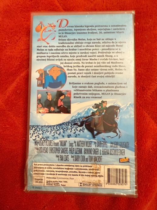 Prodajem rabljenu VHS kasetu Disney klasika "Mulan" u dobrom stanju. Originalno izdanje popularnog animiranog filma o djevojci koja se pretvara da je muškarac kako bi služila u vojsci. Savršeno za kolekcionare Disney VHS kaseta ili ljubitelje klasičnih animiranih filmova.
