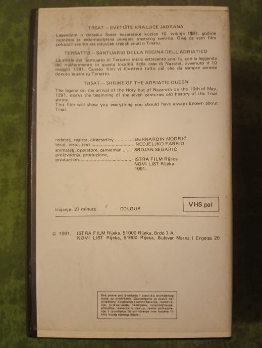 Prodajem VHS kazetu, Trsat-svetište kraljice Jadrana. Trajanje 27 minuta, Istra film Rijeka 1991g. Plačanje na račun ili gotovina.