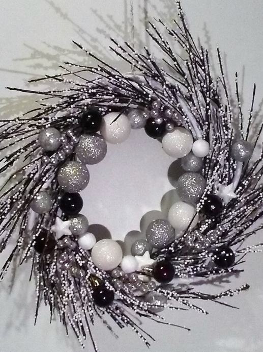 Božićni vijenac za vrata, ručno rađen, otmjen (luxury style), u kombinaciji srebrnih i bijelih kuglica s malim kuglicama boje trule višnje i decentnim zvjezdicama.